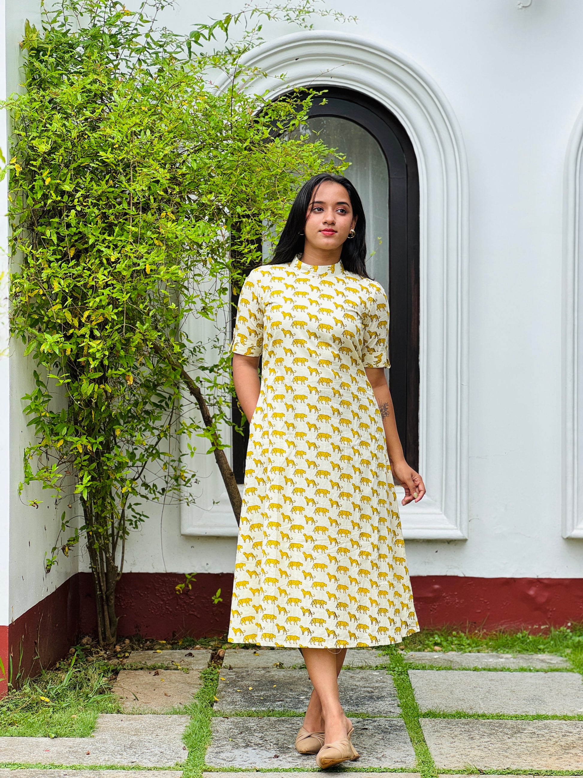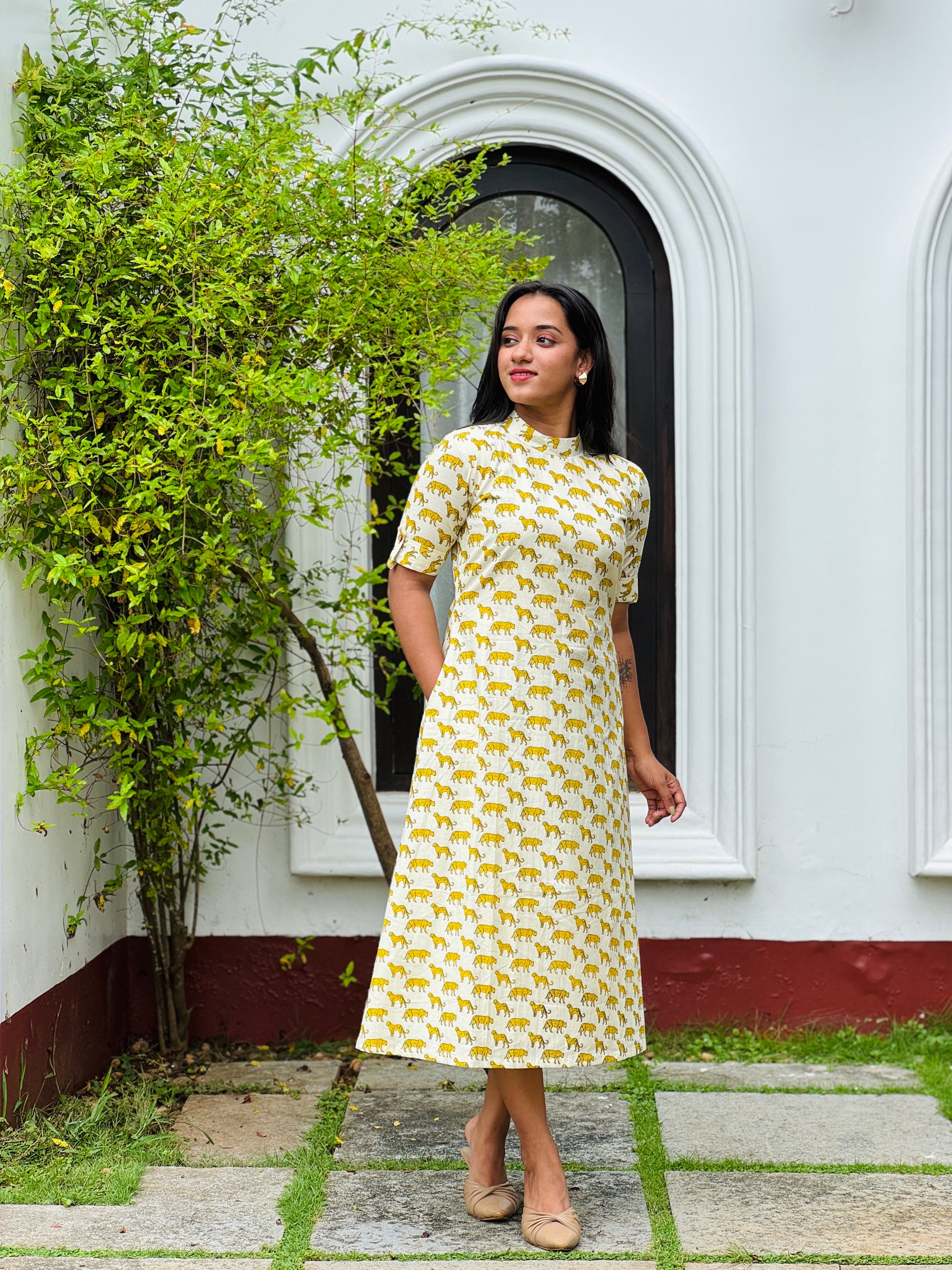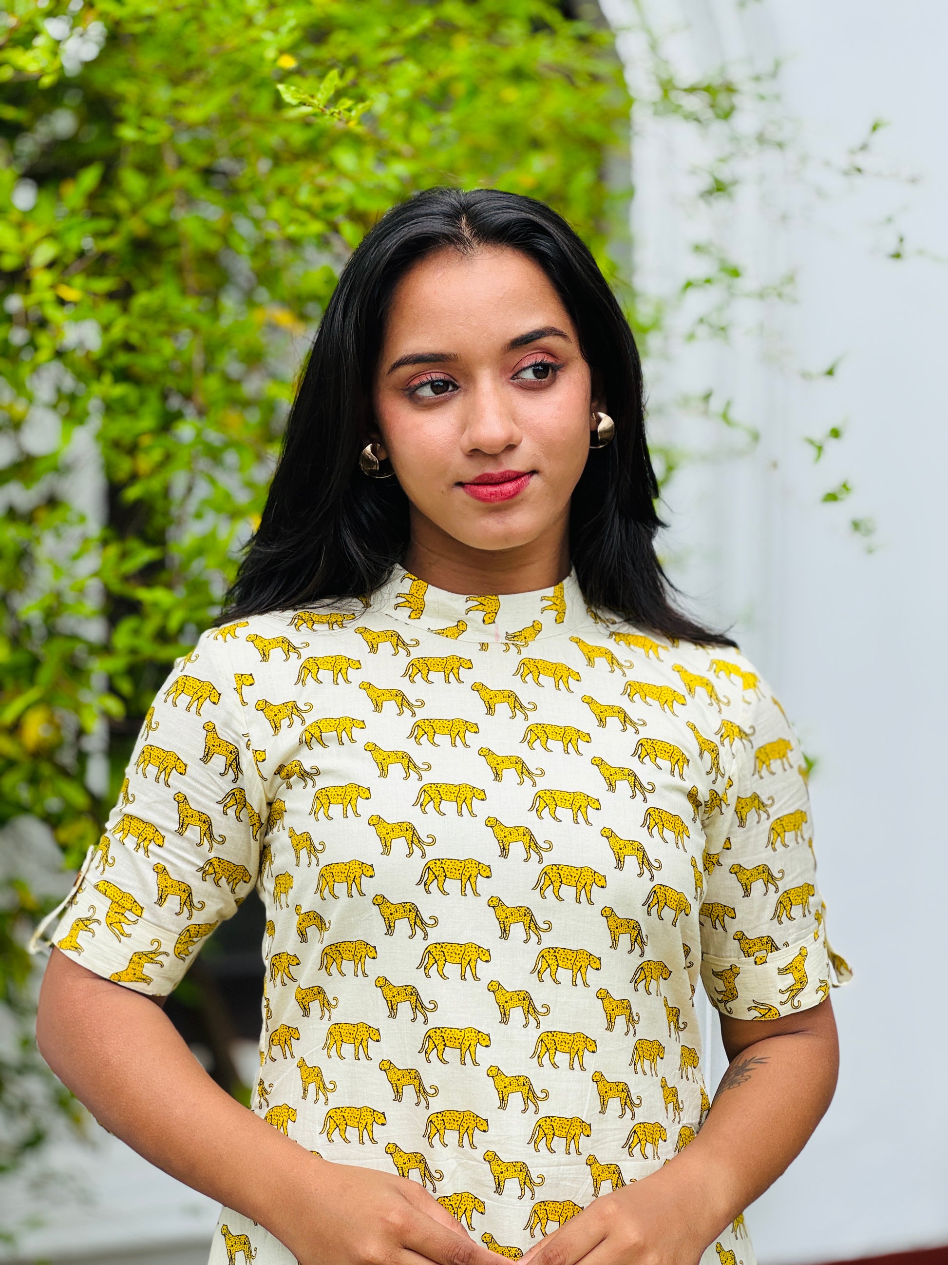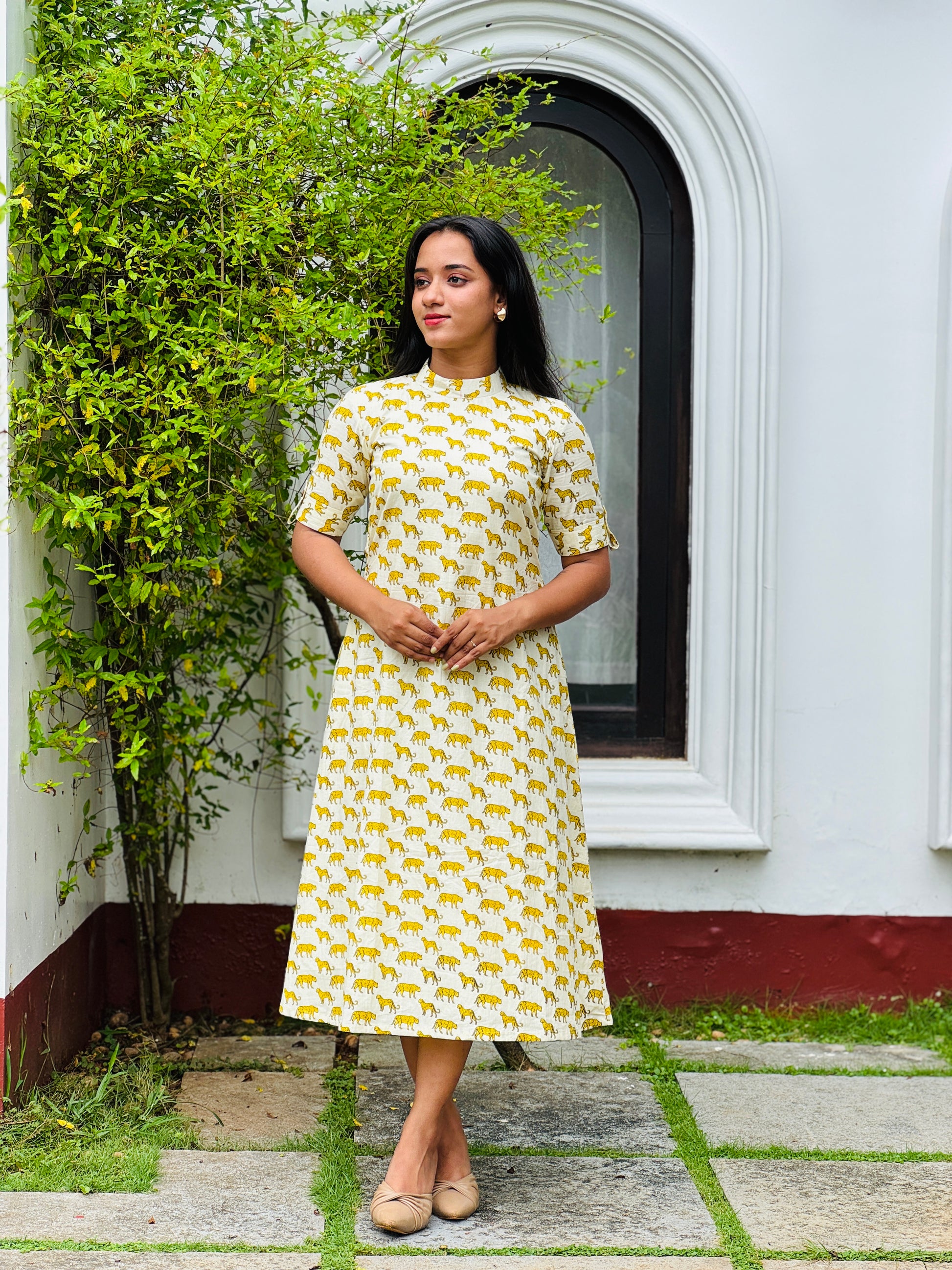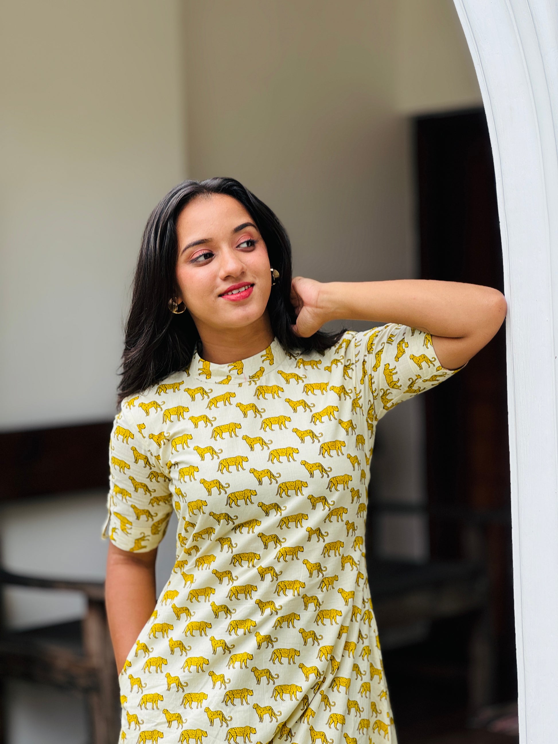 Pure Cotton off white aline kurta/dress with cheetah prints all over with elbow loop button sleeves