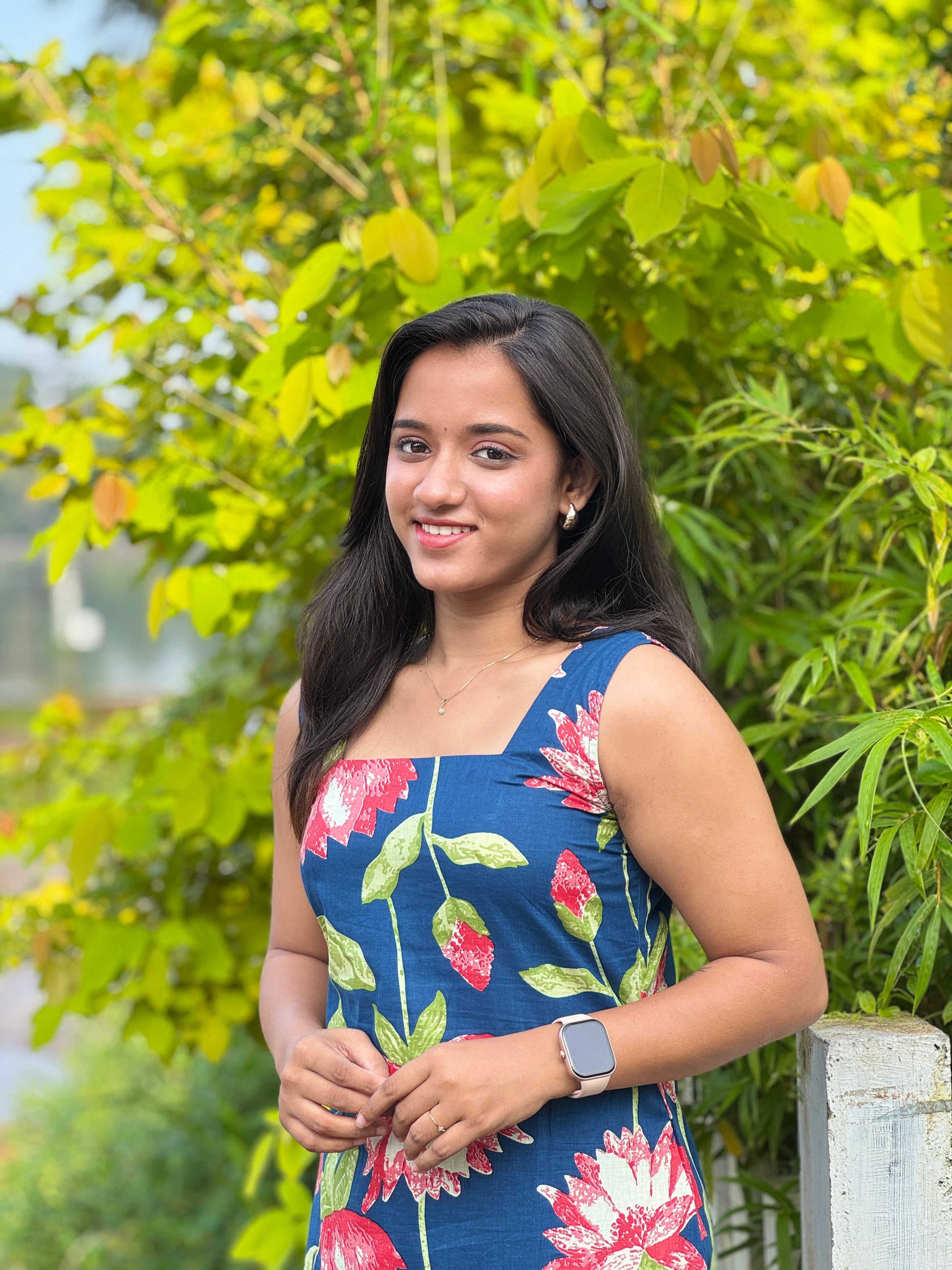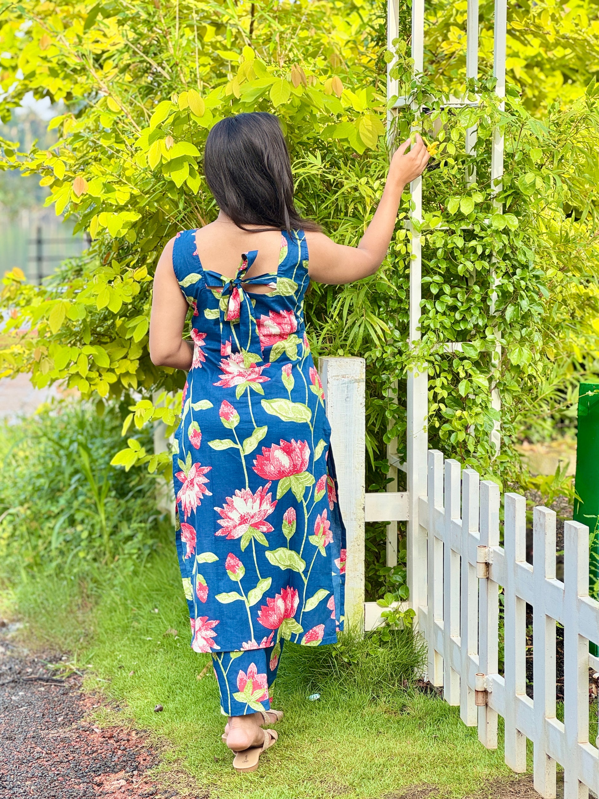 Pure cotton blue with lotus printed straight kurta with square neck in front and back neck with knots paired with pants