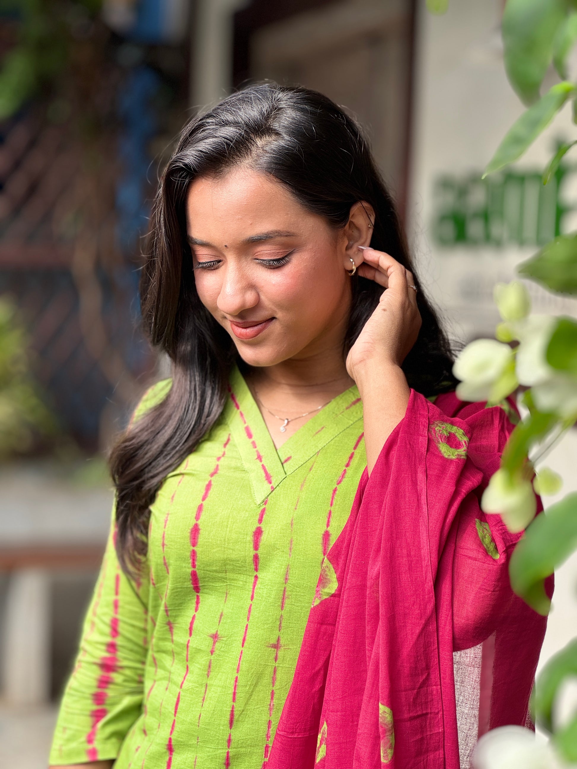 Pure cotton shibori printed kurta and pant in soothing green with crimson red shade combination with V neck and 3/4 sleeve paired with matching cotton dupatta