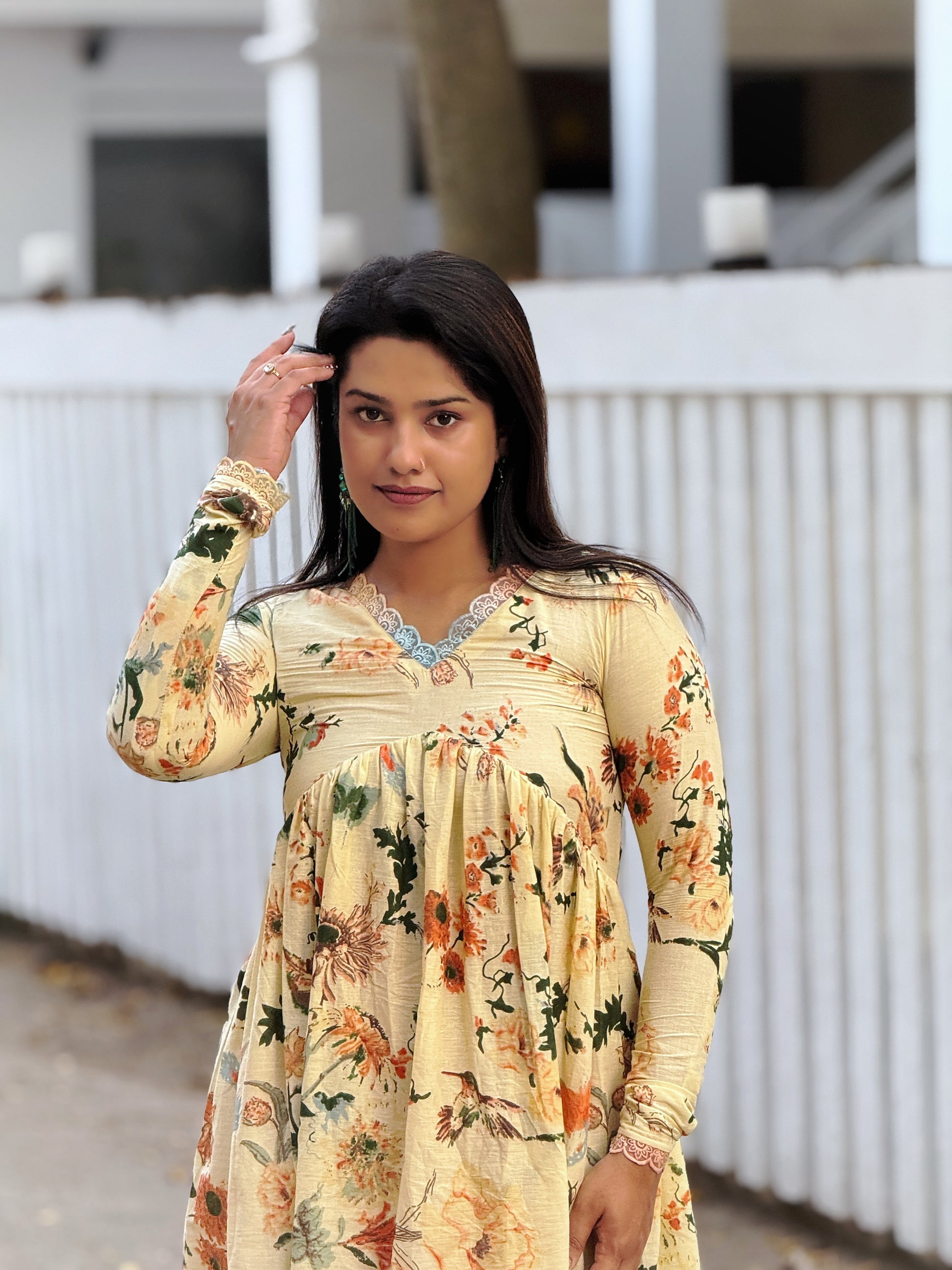 Pure cotton alia cut dress/kurta with floral print allover, given full sleeves with lace detailing. Neck V neck with multishaded lace