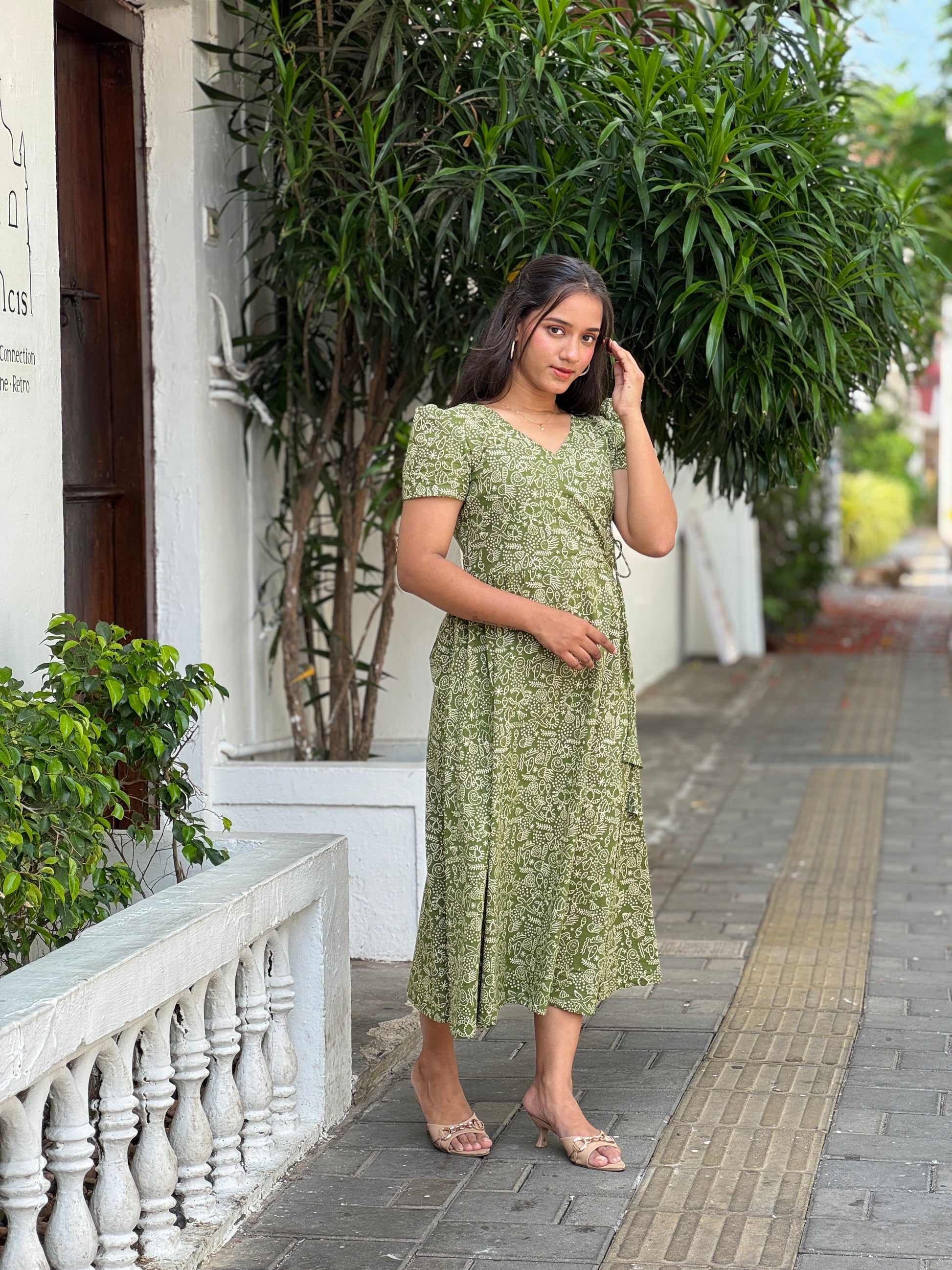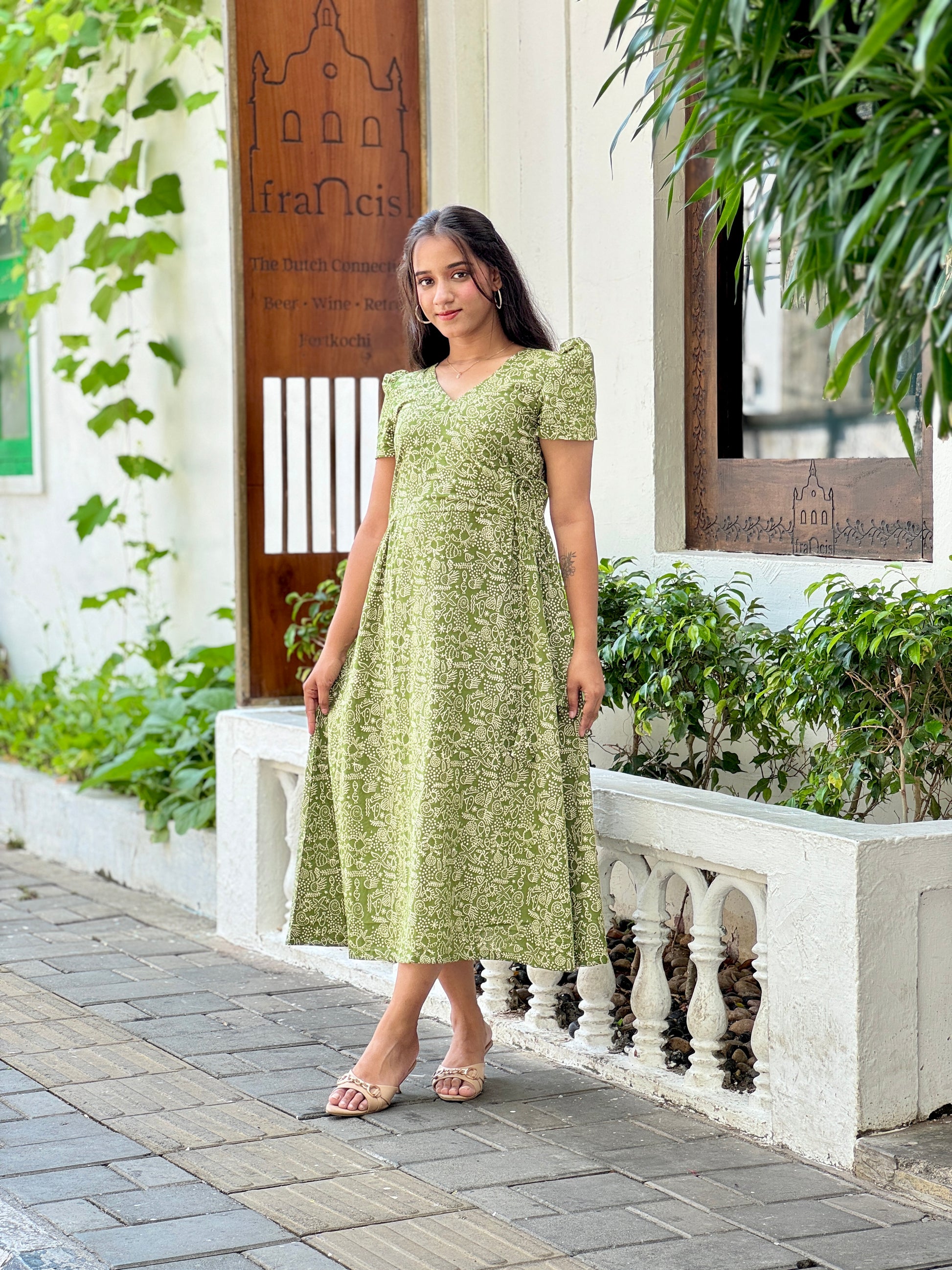 Pure cotton block printed olive green angrakha yoke dress with side gathers in front and back, sleeve given short puff