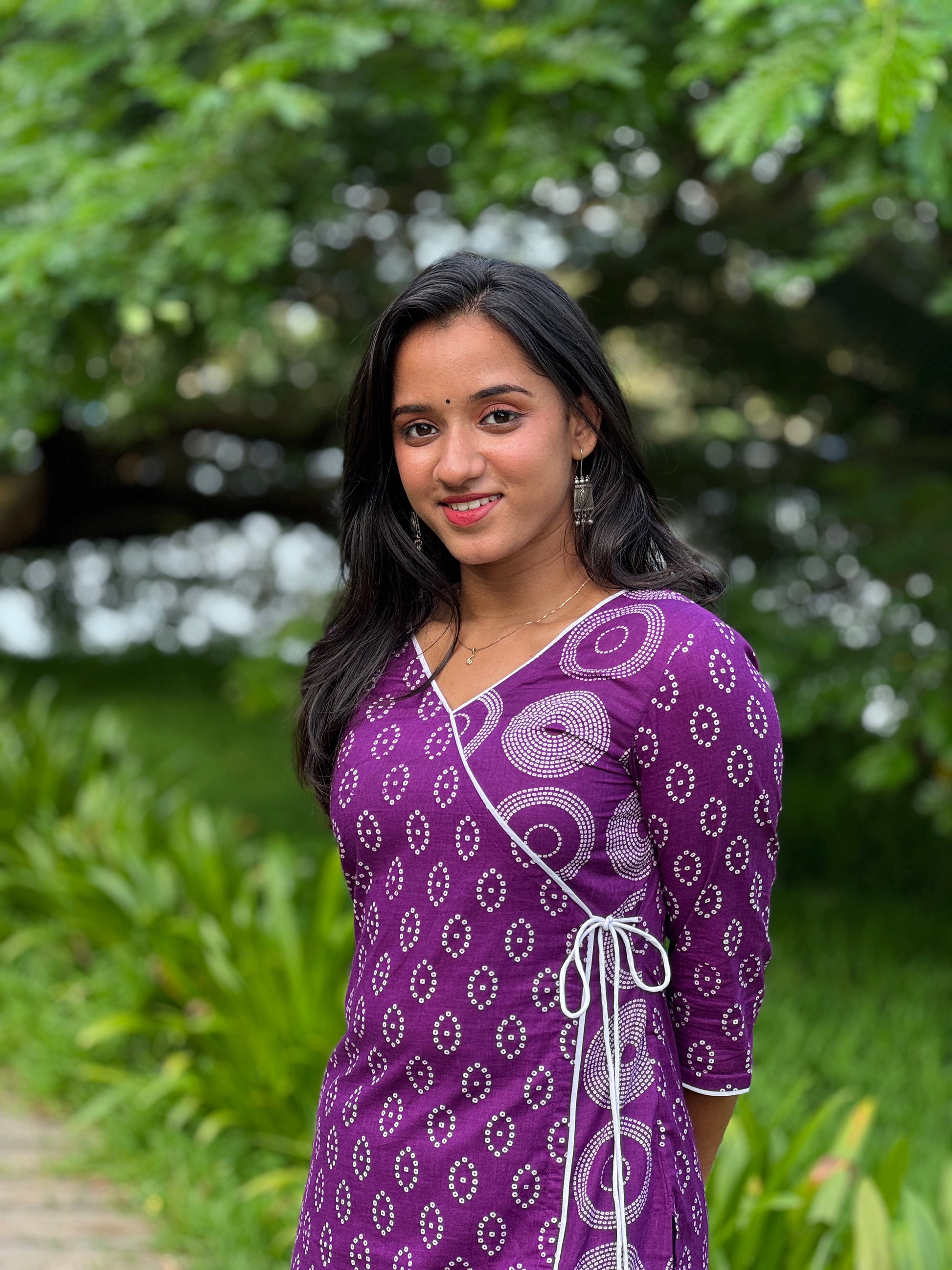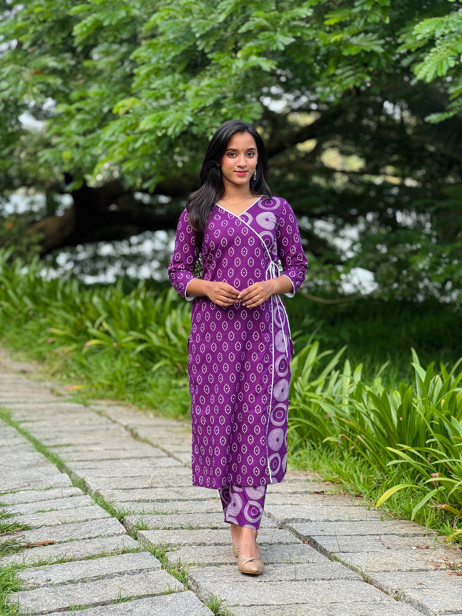 Pure cotton purple bandani printed straight kurta and pant set with angrakha detailing in front side
